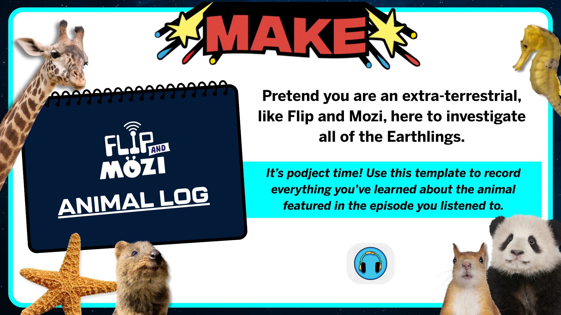 Join Flip and Mozi on an intergalactic musical adventure featuring all the amazing animals that bring WOW to our earth. Episodes run about 20 minutes. Associated podjects invite students to listen, reflect, and then investigate an aspect of our planet and its inhabitants.